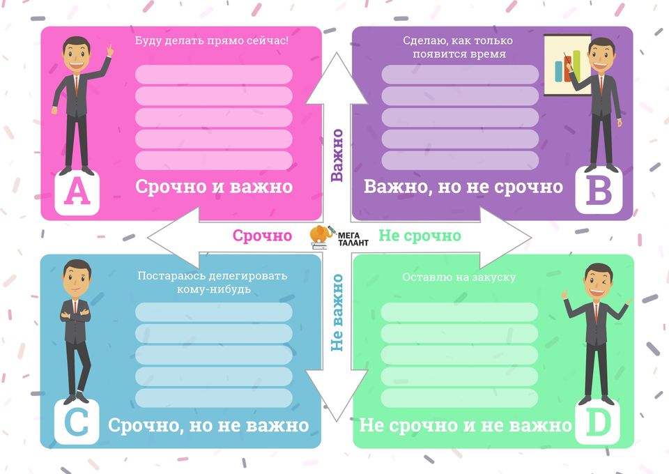 Эта техника тайм менеджмента для расстановки приоритетов. Ее использование позволяет выделить важные и существенные дела и решить, что делать с остальными.